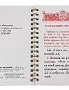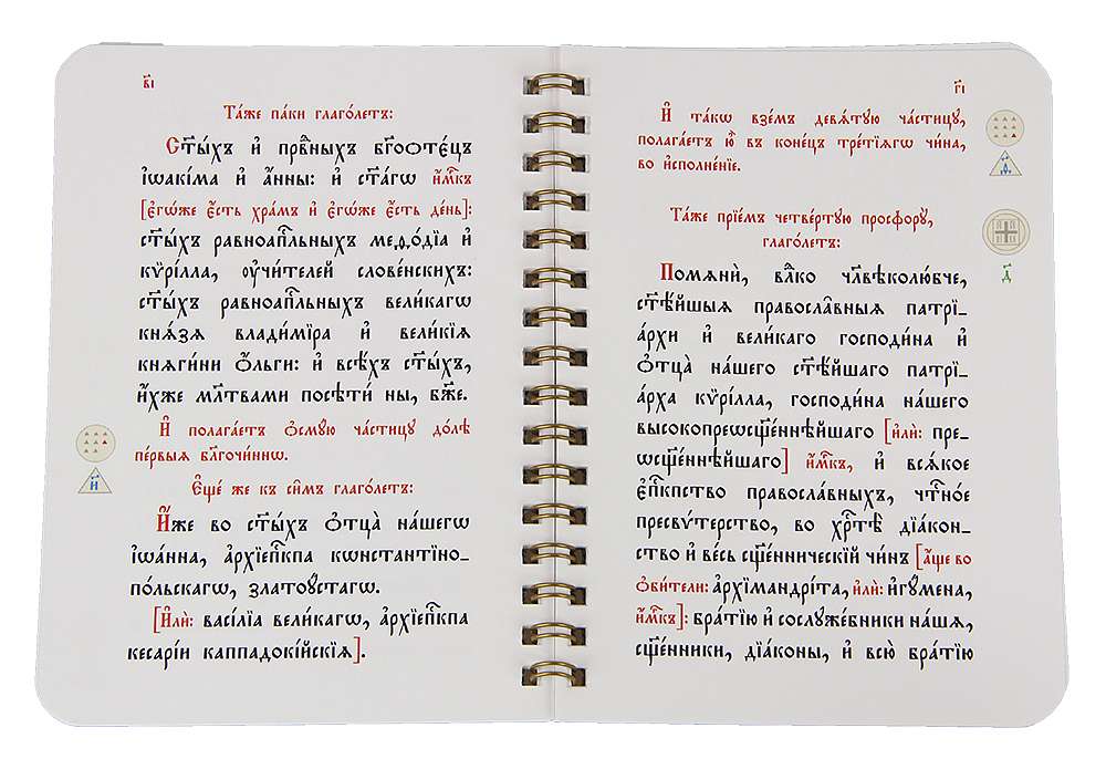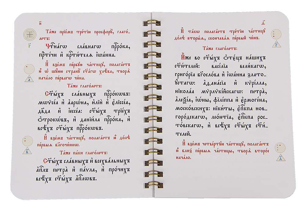 Сторонки обложки сделаны из специального запечатываемого пластика, который не боится влаги. Углы блокнота скруглены, чтобы улучшить их износостойкость. Блок напечатан на плотной мелованной бумаге (150 г) в две краски. На полях для наглядности помещены схематические рисунки просфор, которые указывают на соответствующее последованию действие.