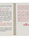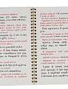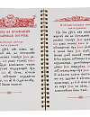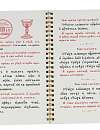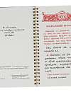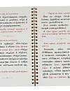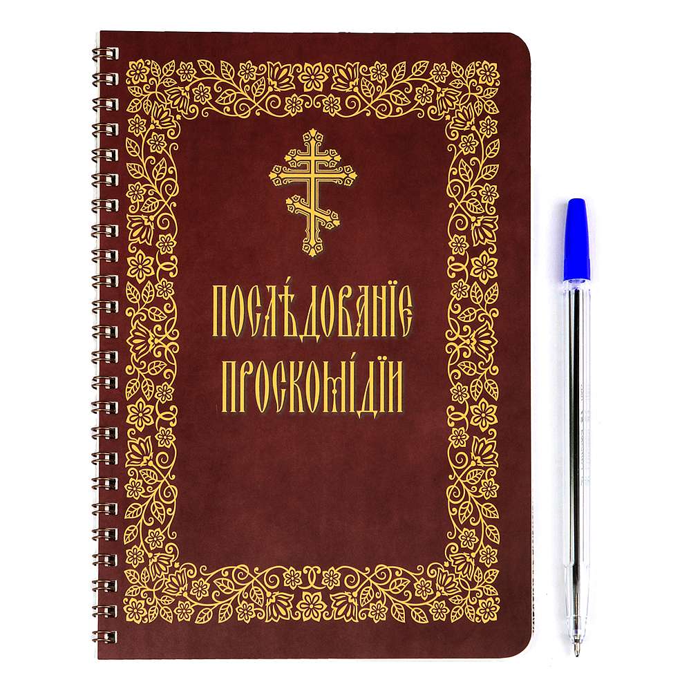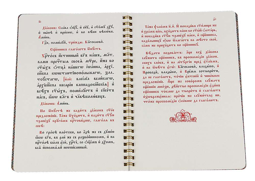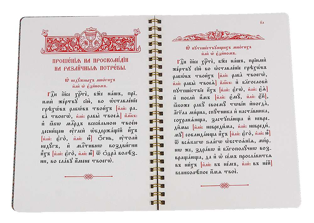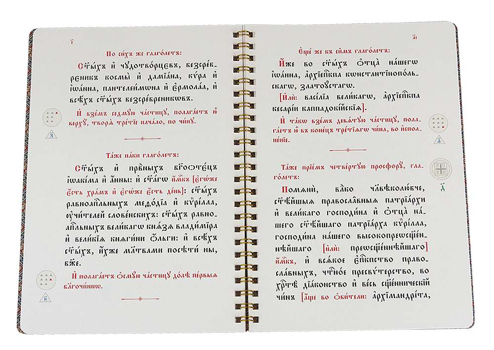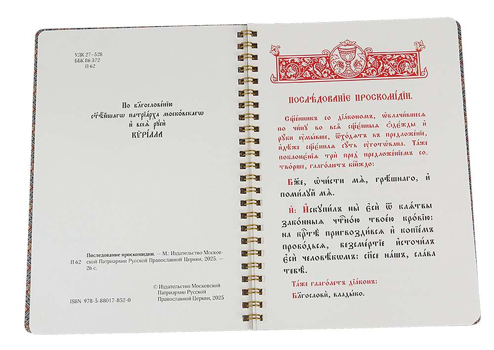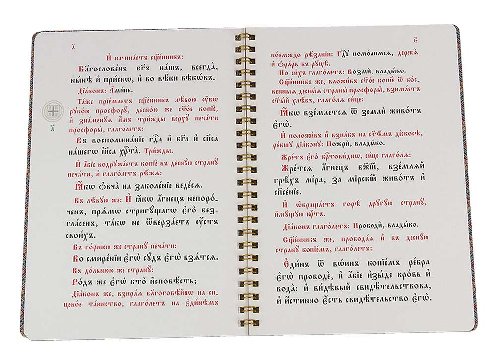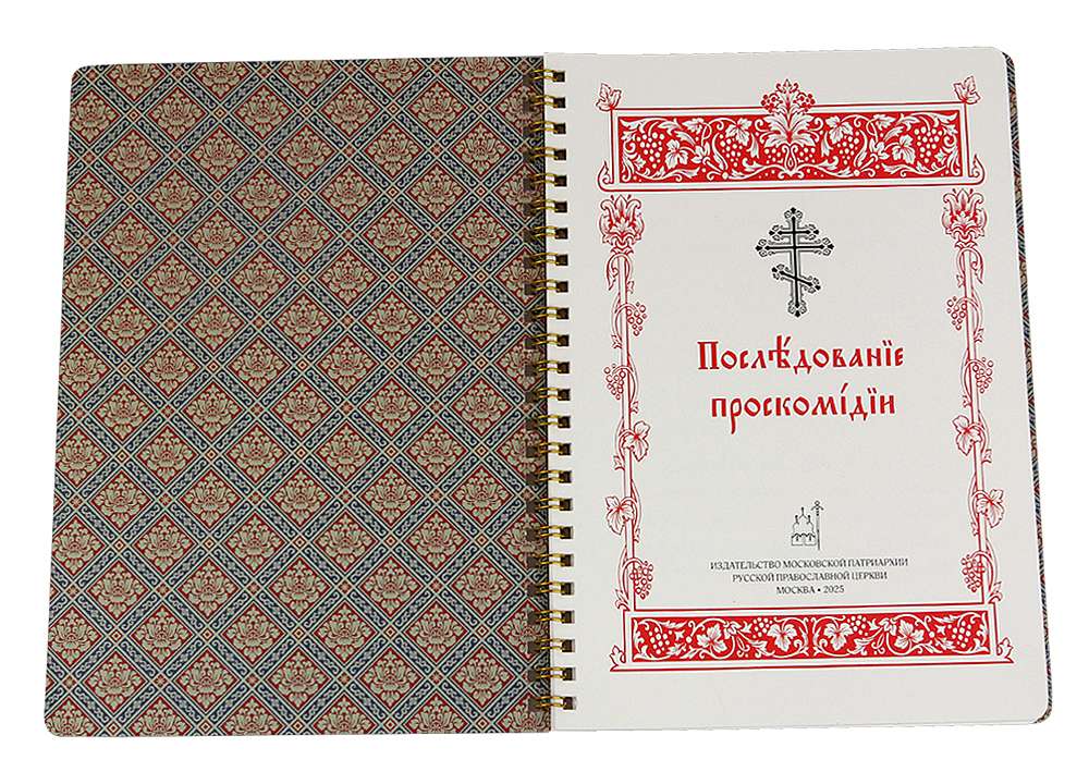 Книга выполнена в виде блокнота на металлической пружине, как и предыдущее издание малого формата. Принцип блокнота позволяет полностью раскрыть книжку и не заботиться всё время совершения проскомидии о том, чтобы книжка не закрывалась, как это обычно бывает с любым служебником в твёрдом переплете. Сторонки обложки сделаны из специального запечатываемого пластика, который не боится влаги. Блок напечатан на плотной матовой мелованной бумаге (150 г). Углы блокнота скруглены, чтобы улучшить их износостойкость. Текст проскомидии набран традиционным церковнославянским шрифтом в две краски. Фон сделан кремовым, чтобы уменьшить его контраст с текстом. Для наглядности на полях помещены схематические рисунки просфор, которые указывают на соответствующее последованию действие. Также текст размечен тонкими изящными разделителями в соответствии с вынимаемыми из просфор частицами. В качестве приложения помещены «Прошения на проскомидии на различныя потребы». Книжечка понравится тем, кто любит использовать при богослужении книги среднего формата с более крупным шрифтом.