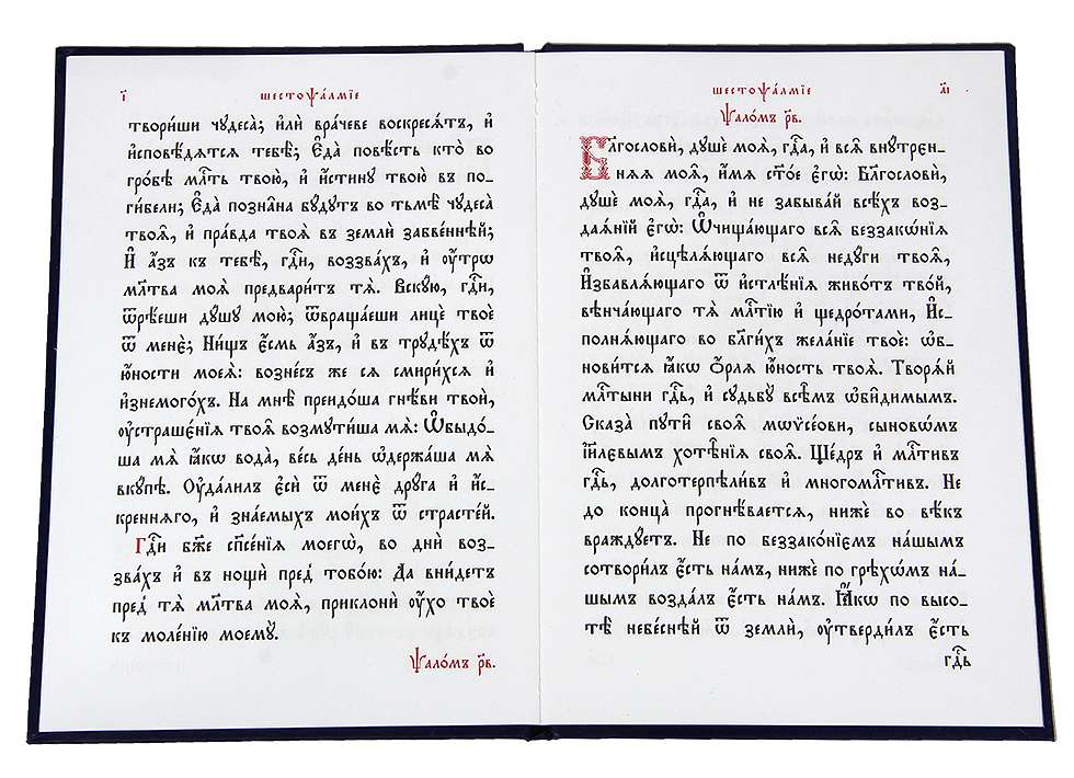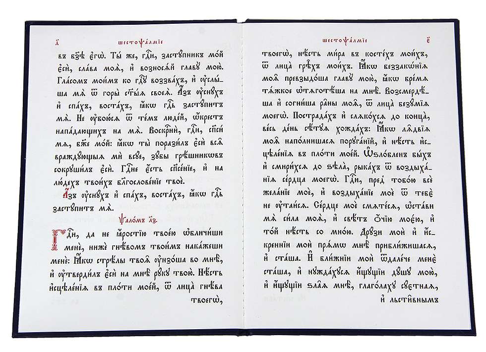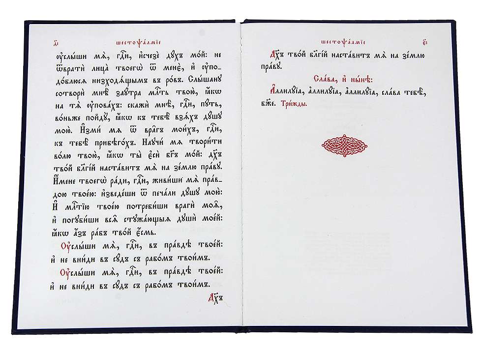 Эта богослужебная книга необходима в каждом храме и порадует каждого церковного чтеца. Она содержит шесть псалмов (Шестопсалмие), которые читаются на Утрени. Книга очень лёгкая (всего 16 страниц), небольшого формата (20х14 см): её удобно держать в руках при чтении псалмов. Напечатана крупным церковнославянским шрифтом «Triodion», в две краски. Красивое художественное оформление (орнаменты, буквицы). Бумага прочная, переплёт твёрдый. Книга прослужит долго.