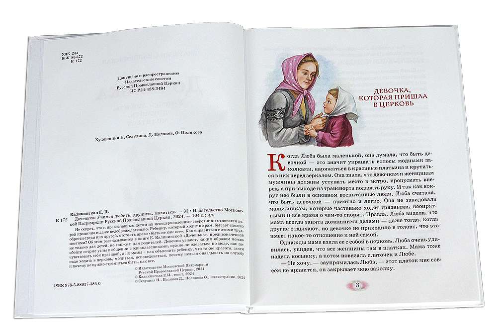 Не секрет, что к православным детям их невоцерковлённые сверстники относятся порой иронично и даже недоброжелательно. Ребёнку, который ходит в храм, бывает сложно обрести среди них друзей, отстоять право «быть не как все». Как справиться с этими трудностями? Об этом рассказывается в книге Екатерины Каликинской «Доченька», предназначенной не только для детей, но также и для родителей. Девочки узнают, каким образом можно обойти острые углы в общении с одноклассниками, нужно ли одеваться по моде, как почувствовать себя красивой, а их мамы — как объяснить ребёнку, что такое красота, зачем надо ходить в церковь, молиться, исповедоваться, почему нельзя опаздывать на службу и почему не нужно стремиться быть, как все.