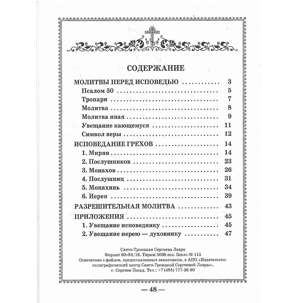 В книге представлен Чин последования исповеди: молитвы перед исповедью, исповедание грехов мирян, послушников, монахов, иереев, а также разрешительная молитва. Большим достоинством брошюры является крупный шрифт, поэтому ей могут пользоваться люди со слабым зрением.