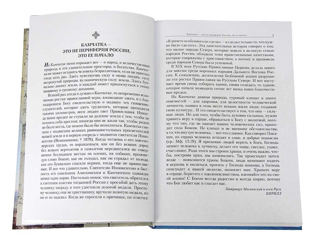 Всякий раз, когда я думаю о Камчатке, то непременно вспоминаю ростки православной веры, взошедшие здесь, и с благодарением Богу свидетельствую о подвиге тех священнослужителей, которые здесь трудились, которые проходили тысячи километров, неся людям свет Православия. Никогда наши предки не ступали на далекие земли с тем, чтобы не осенить себя крестом; никогда они не жили так, чтобы рядом не было места, где можно было бы помолиться. Камчатка связана с подвигами великих равноапостольных просветителей нашей земли и в первую очередь с подвигом святителя Иннокентия (Вениаминова; † 1879). Когда читаешь о его миссионерских трудах, то поражаешься, как он без всяких дорог, без всяких вертолетов и самолетов передвигался по совершенно безлюдным местам на оленях, на собаках, проповедуя слово Божие, как он голодал, как он страдал от холода, как его буквально спасали коряки, тогда еще не православные. И вот что удивительно. Святителю Иннокентию в бытность его епископом Аляскинским и Камчатским однажды помог один коряк. Настолько помог, что святитель обратился к светским властям тогдашней России с просьбой дать этому человеку награду, и того удостоили золотой медали. Простому человеку, еще не христианину, вручили золотую медаль, но он ее не надевал. Когда же спросили о причинах, он ответил: «Я ничего особенного не сделал — я сделал только то, что нужно было сделать». Эта замечательная история говорит о том, что малые народы Севера, которые вошли в великую семью народов России, обладали теми нравственными качествами, которые сопряжены с христианством, а потому и проповедь среди народов Севера была успешной.