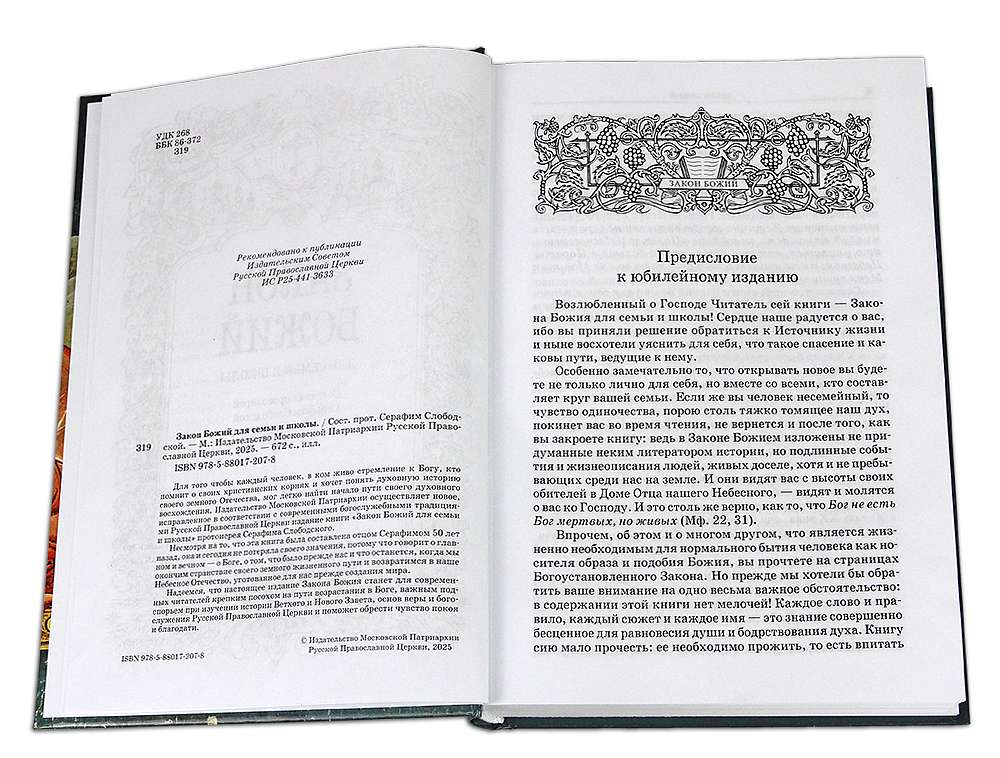 Для того чтобы каждый человек, в ком живо стремление к Богу, кто помнит о своих христианских корнях и хочет понять духовную историю своего земного Отечества, мог легко найти начало пути своего духовного восхождения, Издательство Московской Патриархии осуществляет новое, исправленное в соответствии с современными богослужебными традициями Русской Православной Церкви издание книги «Закон Божий для семьи и школы» протоиерея Серафима Слободского.
