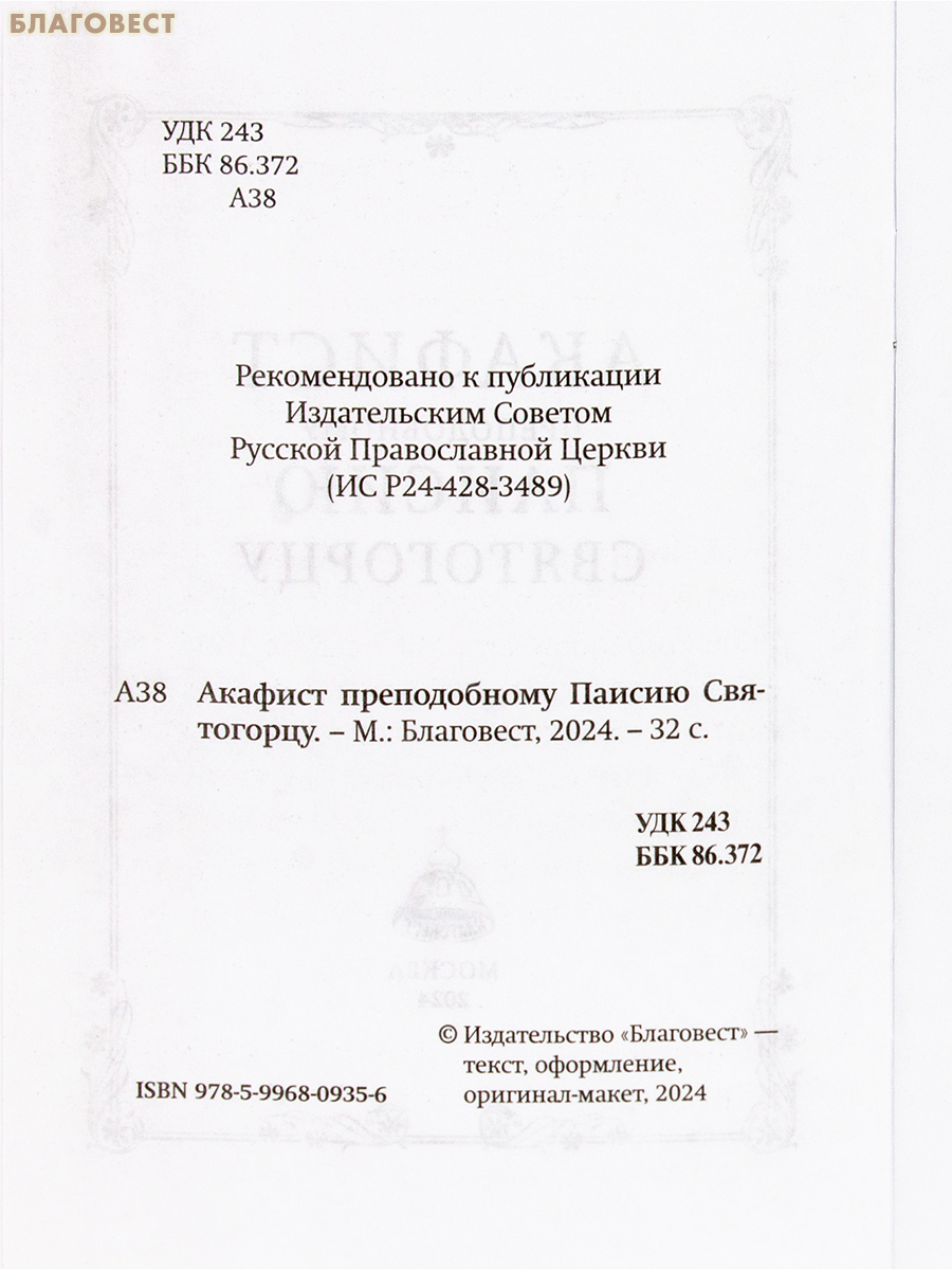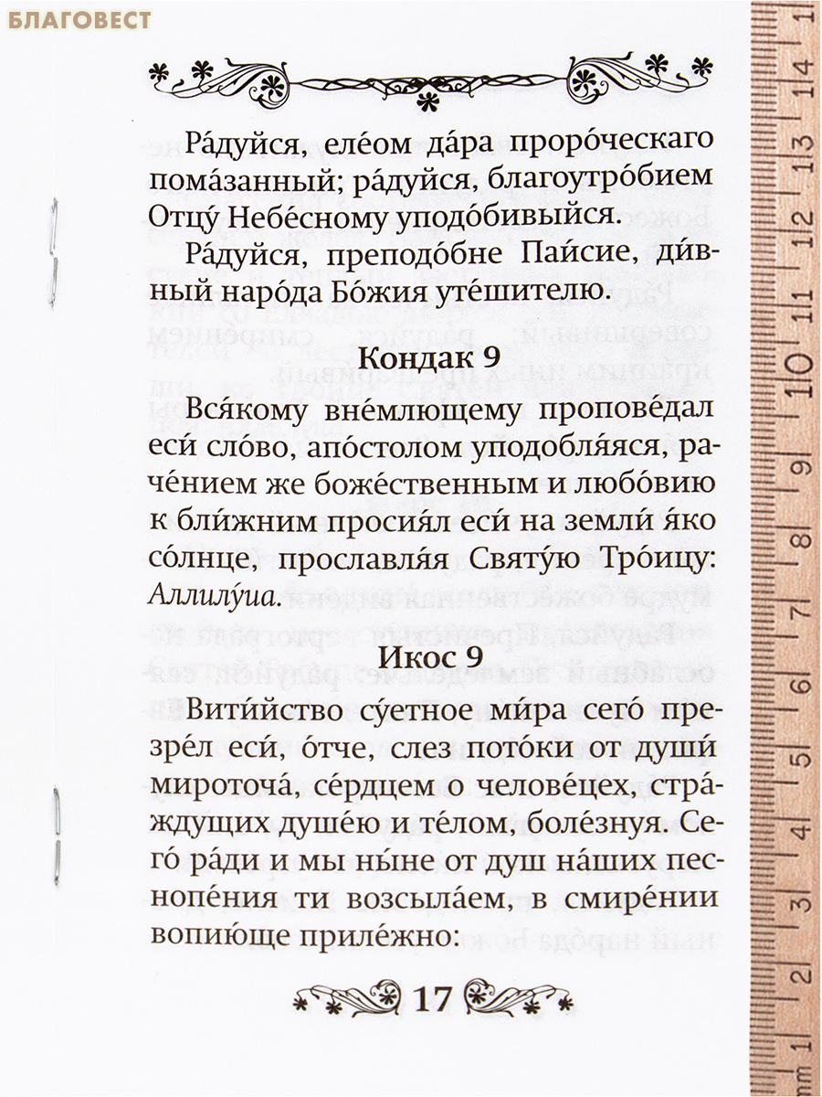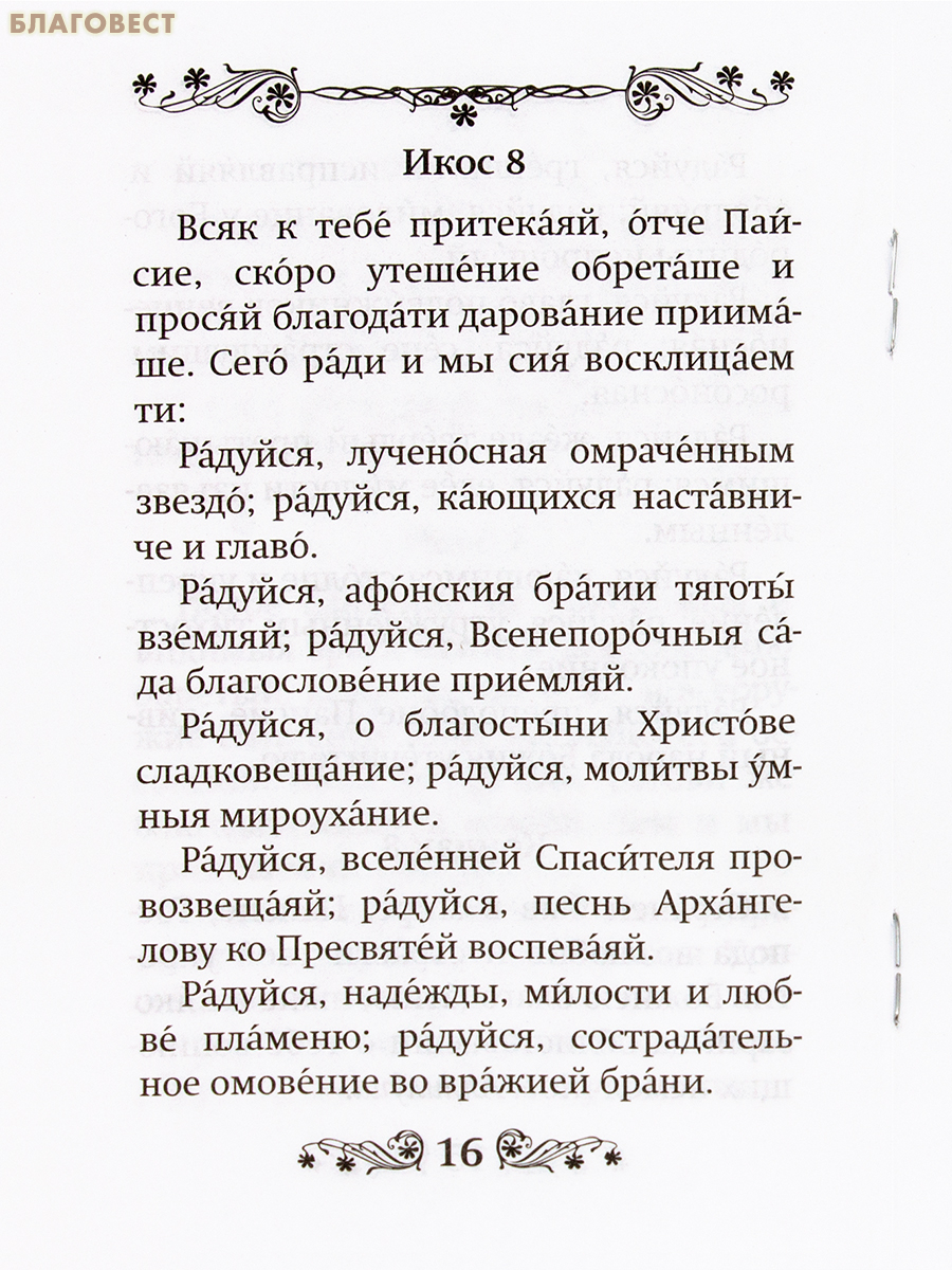 Издание содержит текст акафиста известному преподобному греческому старцу 20 века Паисию Святогорцу, утвержденный для употребления за богослужением и в домашней молитве на заседании Священного Синода 25 июля 2024 года, в гражданской (русской) орфографии, с ударениями.