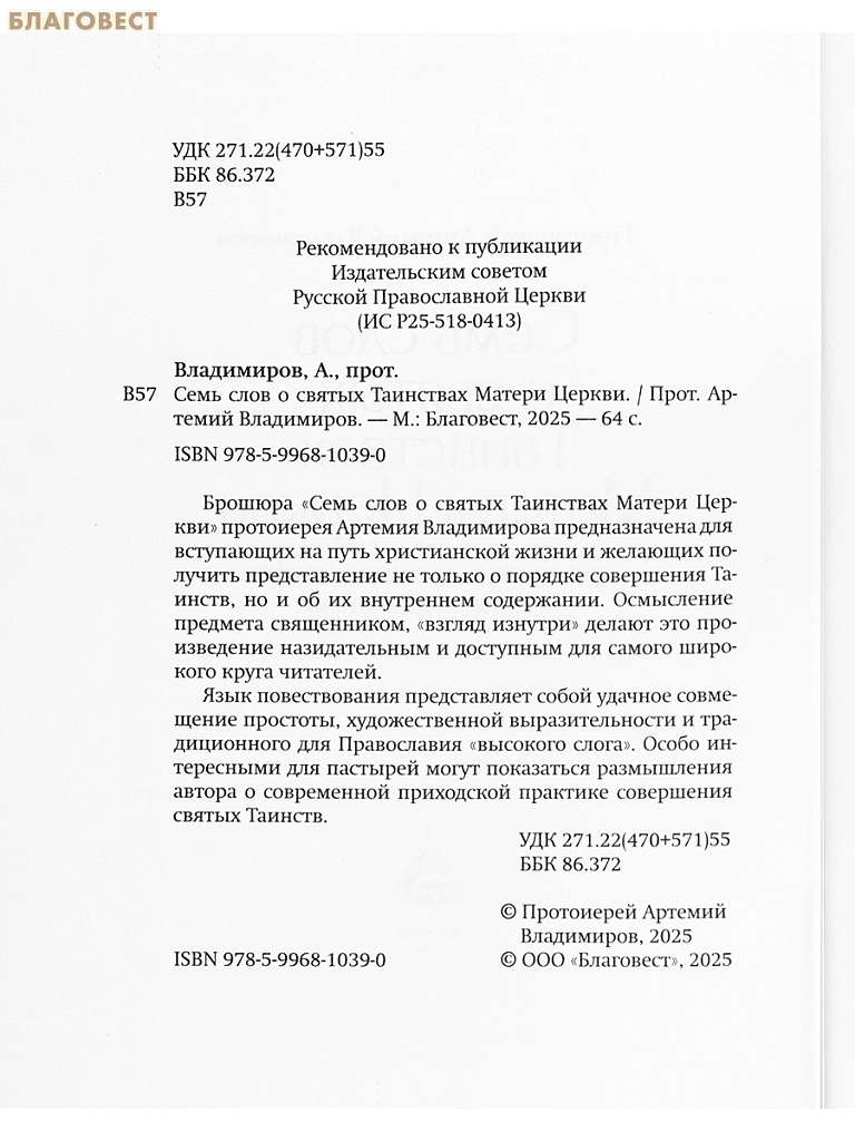 Брошюра «Семь слов о святых Таинствах Матери Церкви» протоиерея Артемия Владимирова предназначена для вступающих на путь христианской жизни и желающих получить представление не только о порядке совершения Таинств, но и об их внутреннем содержании. Осмысление предмета священником, «взгляд изнутри» делают это произведение назидательным и доступным для самого широкого круга читателей.