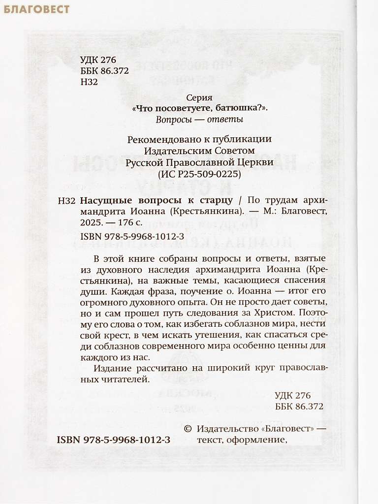 В этой книге собраны вопросы и ответы, взятые из духовного наследия архимандрита Иоанна (Крестьянкина), на важные темы, касающиеся спасения души. Каждая фраза, поучение о. Иоанна — итог его огромного духовного опыта. Он не просто дает советы, но и сам прошел путь следования за Христом. Поэтому его слова о том, как избегать соблазнов мира, нести свой крест, в чем искать утешения, как спасаться среди соблазнов современного мира особенно ценны для каждого из нас.