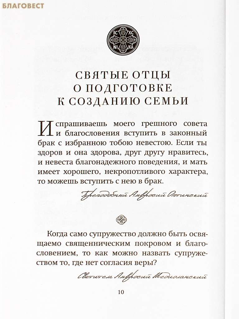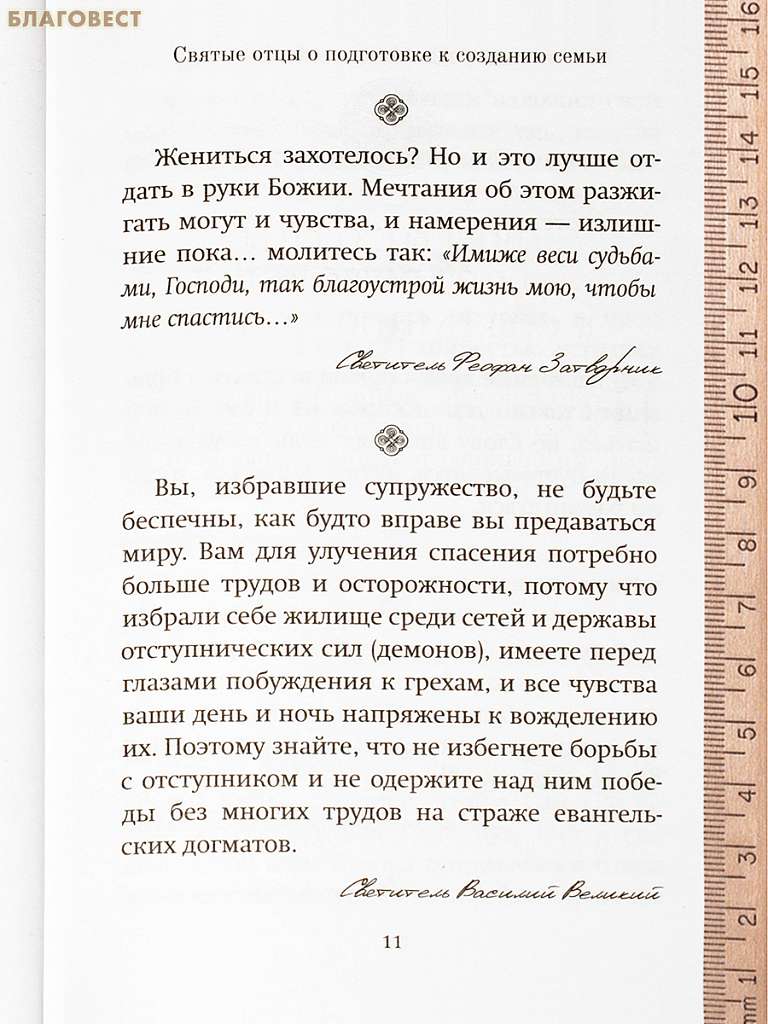 Эта книга является сборником, в который вошли высказывания святых отцов и учителей Христианской Церкви, касающиеся важнейших вопросов в деле спасения каждого человека, связанных с отношением к семье, супружеским обязанностям.