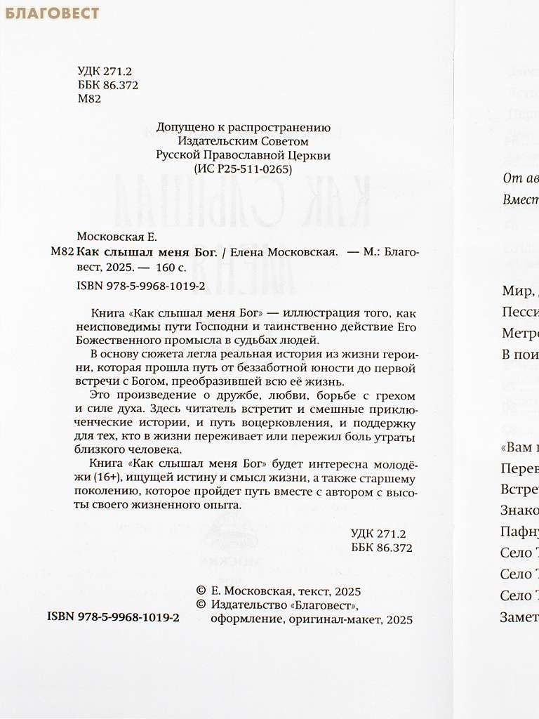 Книга «Как слышал меня Бог» будет интересна молодежи (16+), ищущей истину и смысл жизни, а также старшему поколению, которое пройдет путь вместе с автором с высоты своего жизненного опыта.