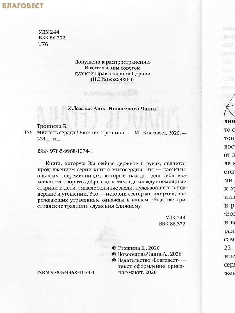 Эта книга главной сестры Сестричества в честь святого великомученика и целителя Пантелеимона, члена Союза писателей России Евгении Трошиной раскрывает тему деятельного милосердия. В ней помещены рассказы о наших современницах, которые находят для себя возможность творить добрые дела там, где их ждут немощные старики и дети, тяжелобольные люди, нуждающиеся в поддержке и утешении. Это — истории сестёр милосердия, возрождающих утраченные однажды в нашем обществе христианские традиции служения ближнему.