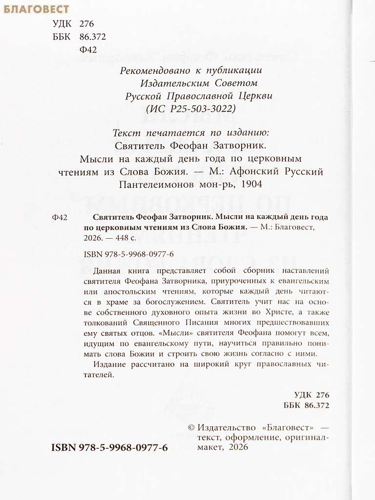 Данная книга представляет собой сборник наставлений святителя Феофана Затворника, приуроченных к евангельским или апостольским чтениям, которые каждый день читаются в храме за богослужением. Святитель учит нас на основе собственного духовного опыта жизни во Христе, а также толкований Священного Писания многих предшествовавших ему святых отцов. «Мысли» святителя Феофана помогут всем, идущим по евангельскому пути, научиться правильно понимать слова Божии и строить свою жизнь согласно с ними.